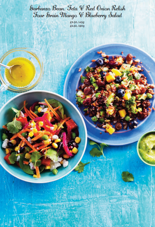 - Top: Four grain Mango & Blueberry salad. £2.50. Bottom: Garbanzo bean, Feta & Red onion relish £2.50